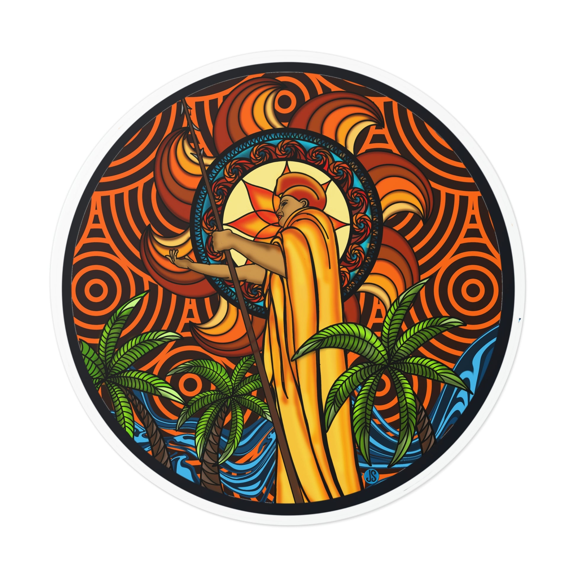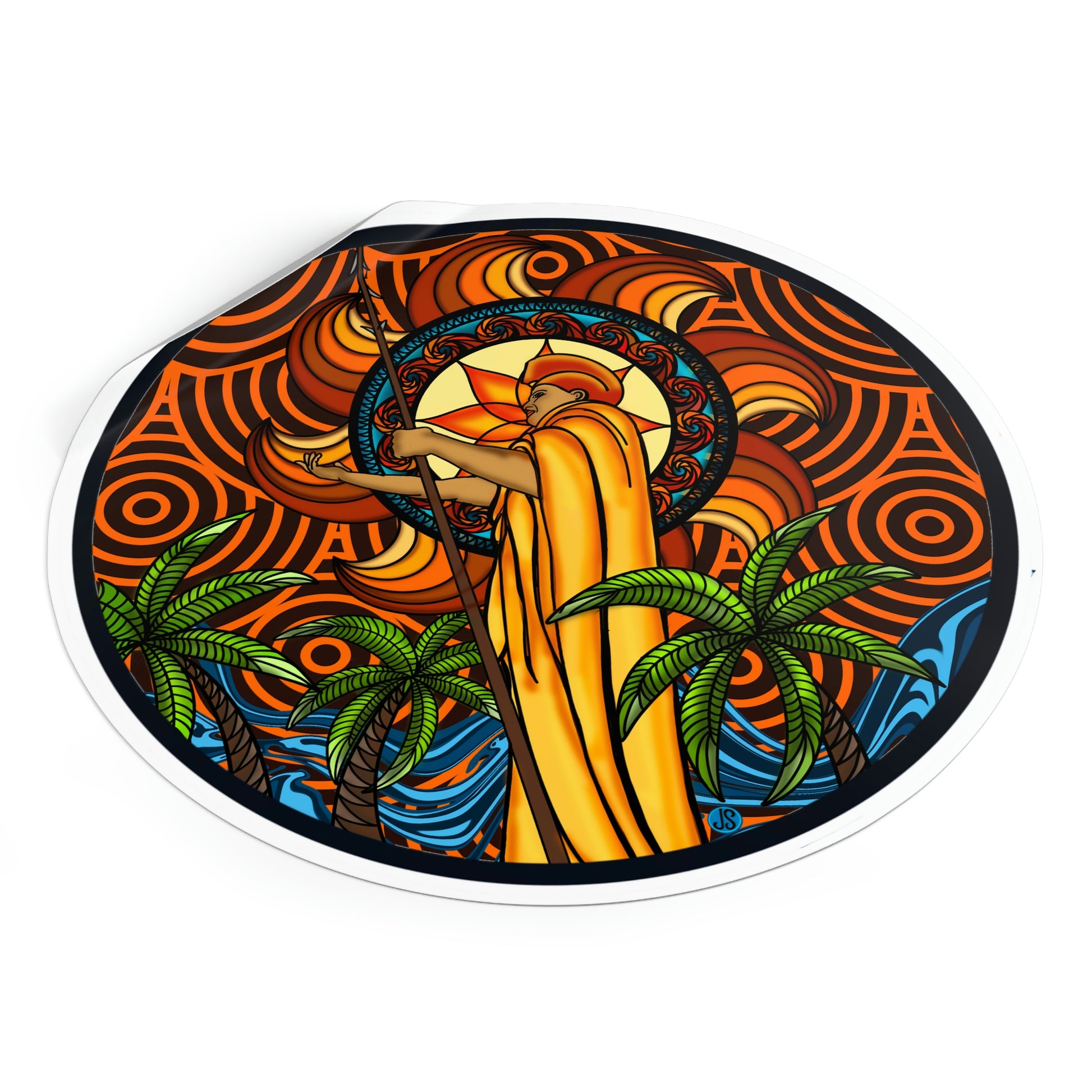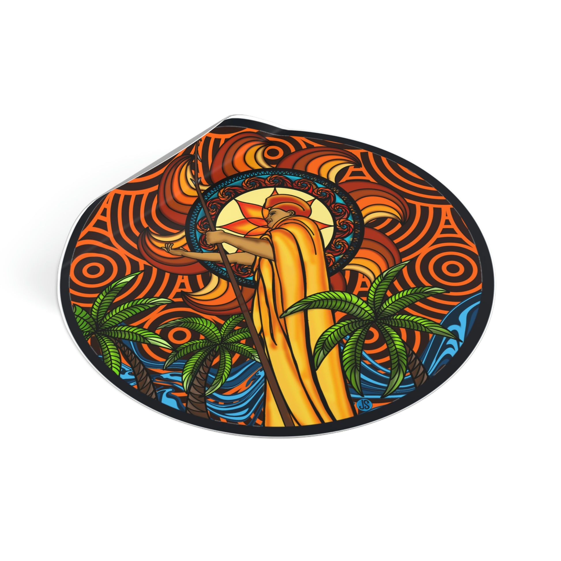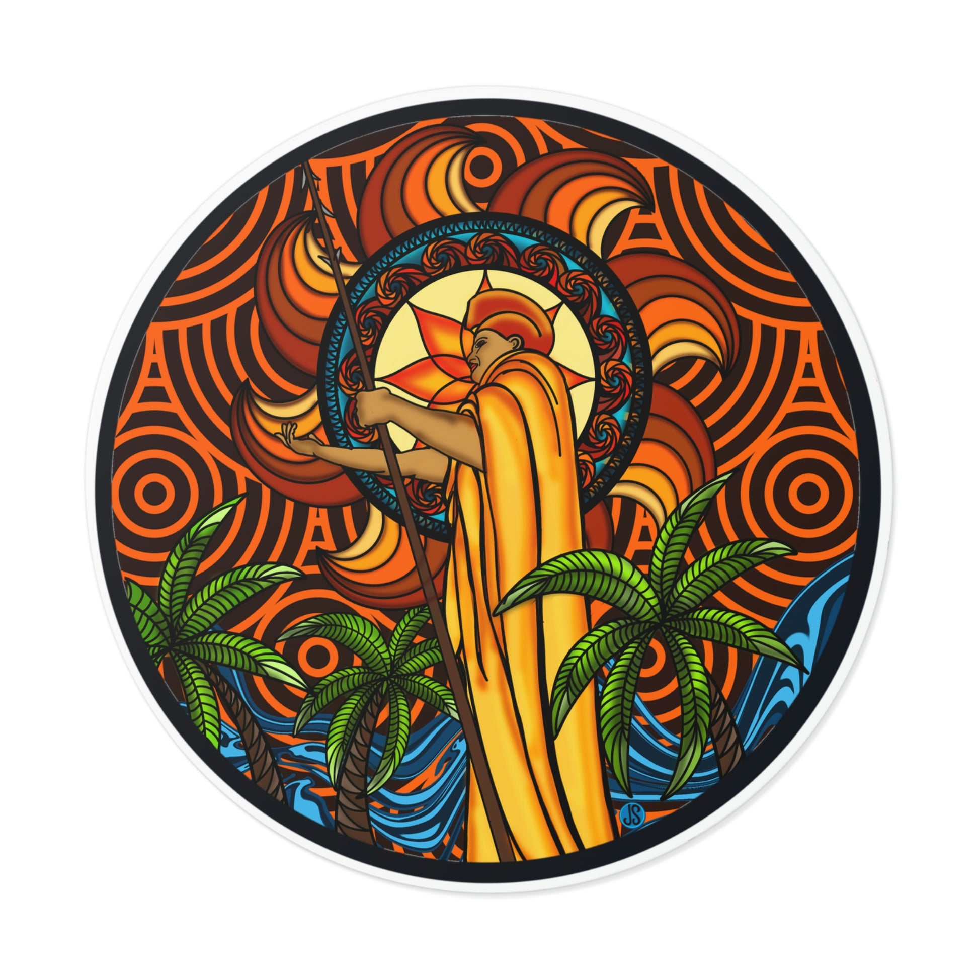 Our KOA Kona Hawaii Round Vinyl Stickers feature an illustration of Kona, Hawaii with its signature king Kamehameha. These high-quality vinyl stickers are weather-resistant and perfect for decorating your car, laptop, or notebook. Show your Hawai'i pride with these beautiful graphic stickers!.: Material: premium water-resistant vinyl.