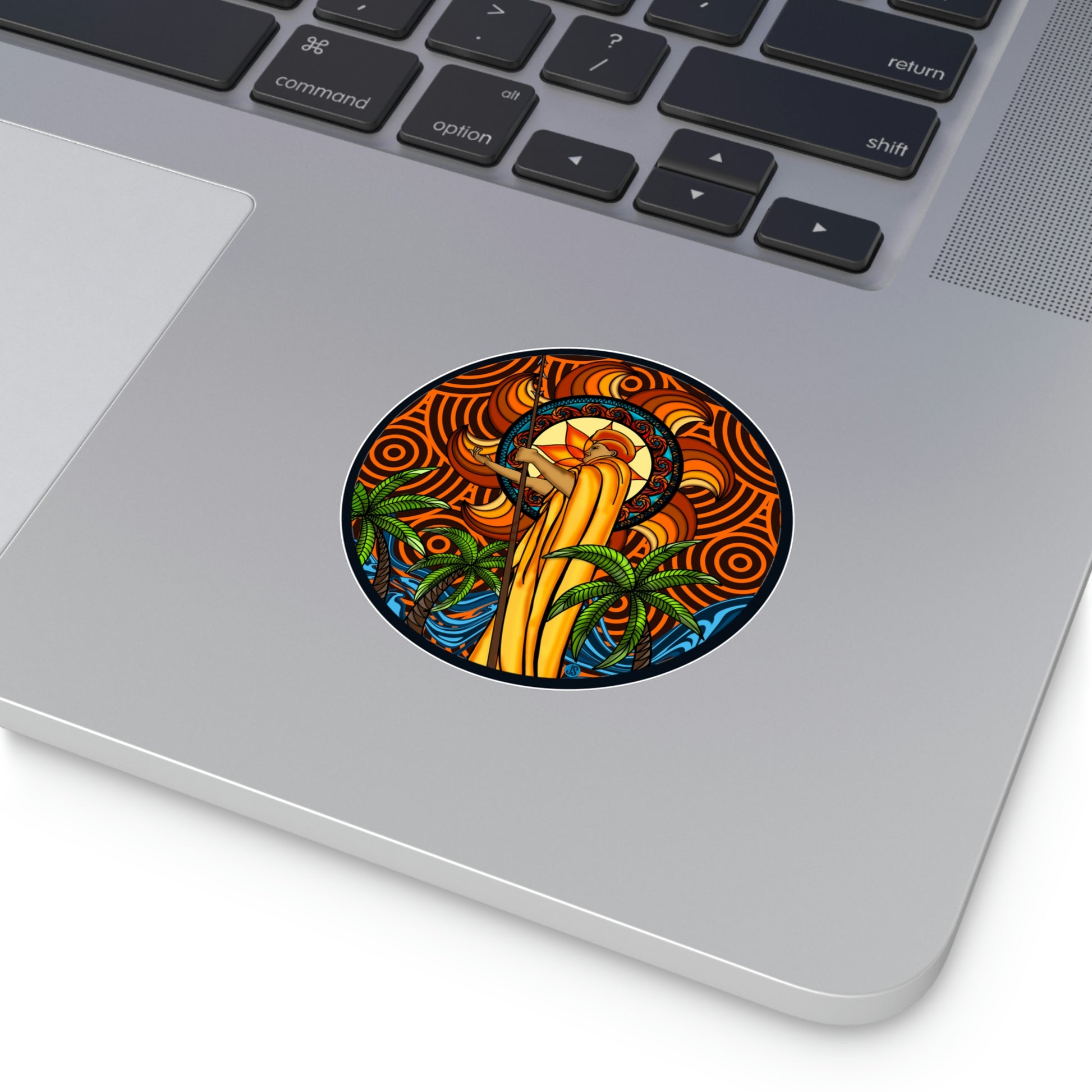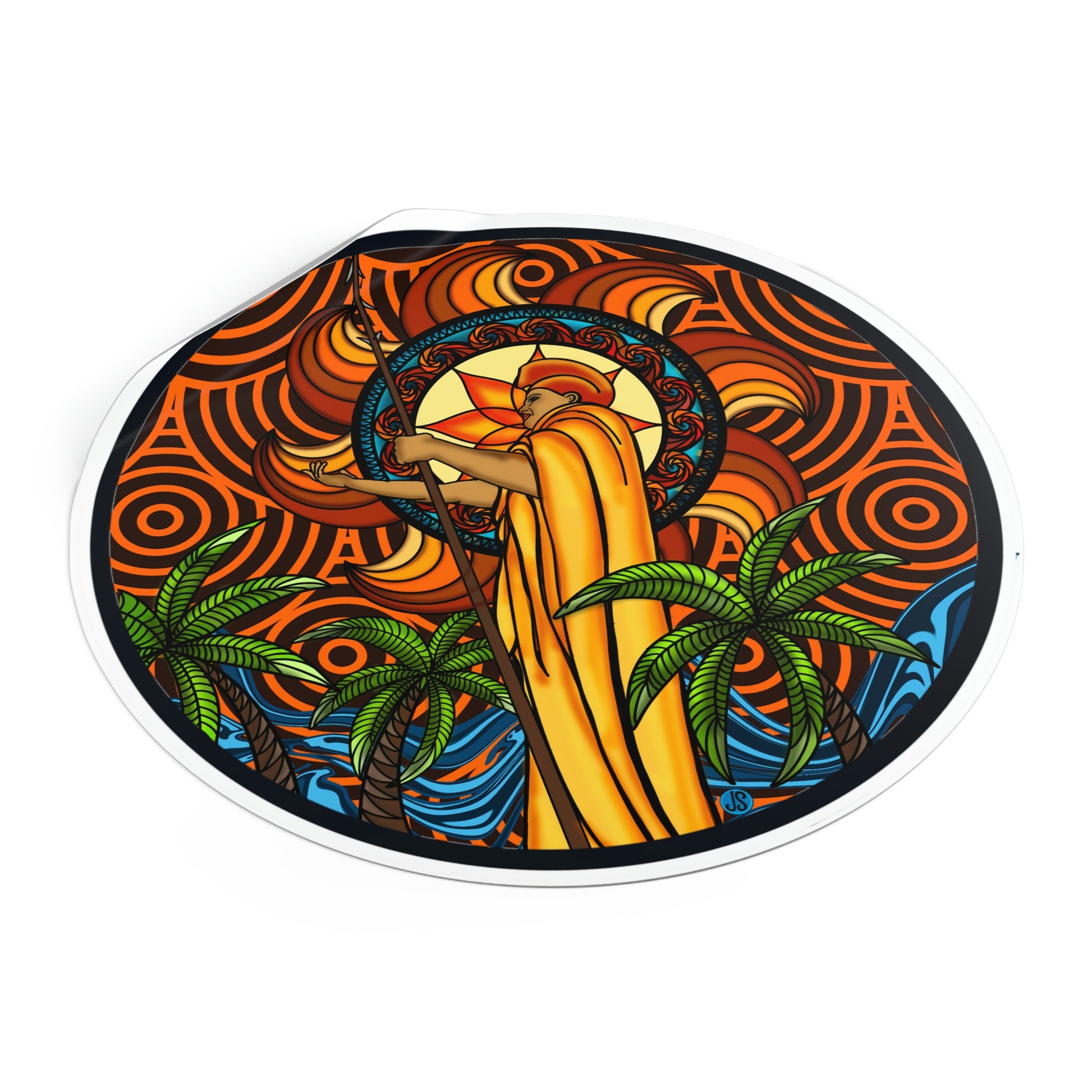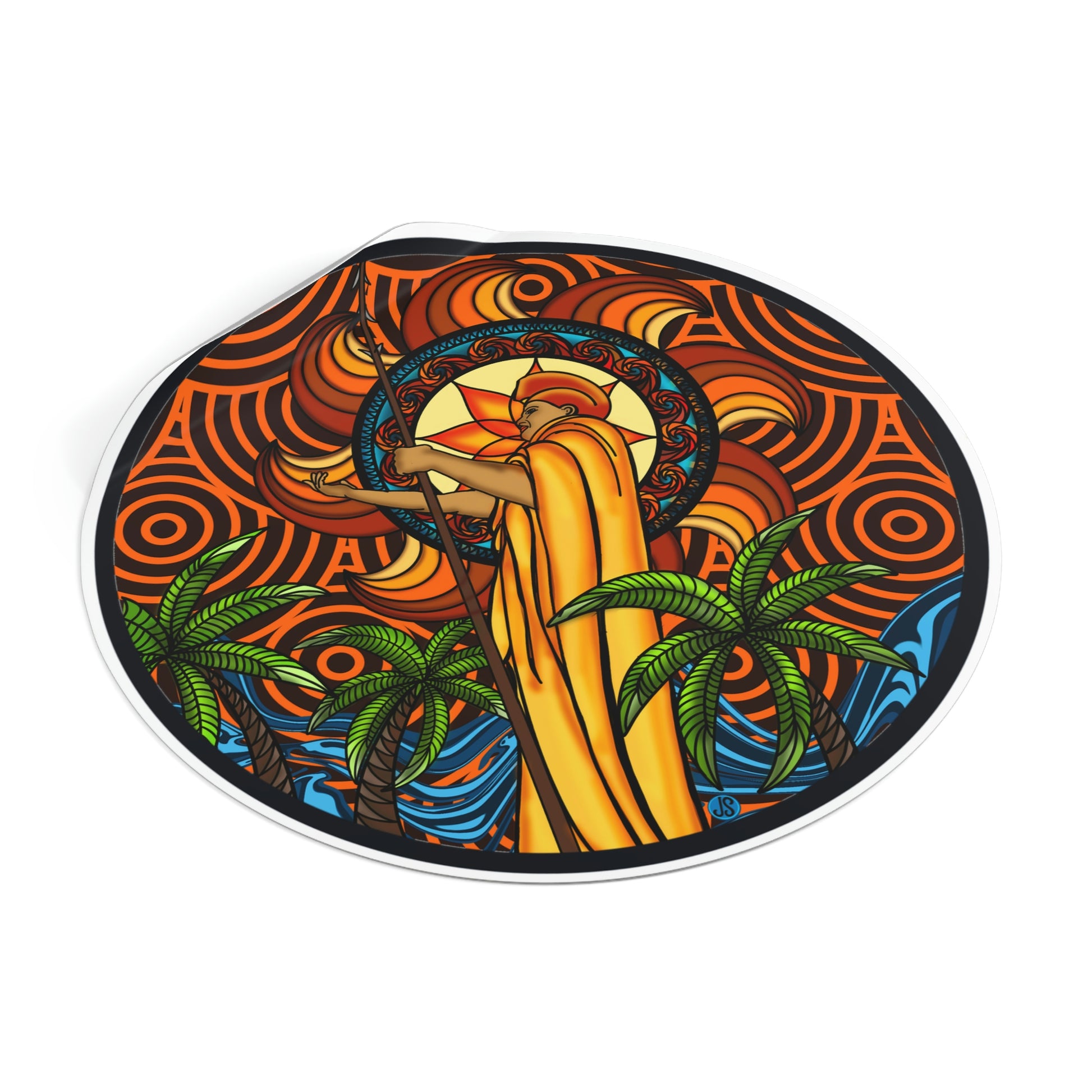 Our KOA Kona Hawaii Round Vinyl Stickers feature an illustration of Kona, Hawaii with its signature king Kamehameha. These high-quality vinyl stickers are weather-resistant and perfect for decorating your car, laptop, or notebook. Show your Hawai'i pride with these beautiful graphic stickers!.: Material: premium water-resistant vinyl.