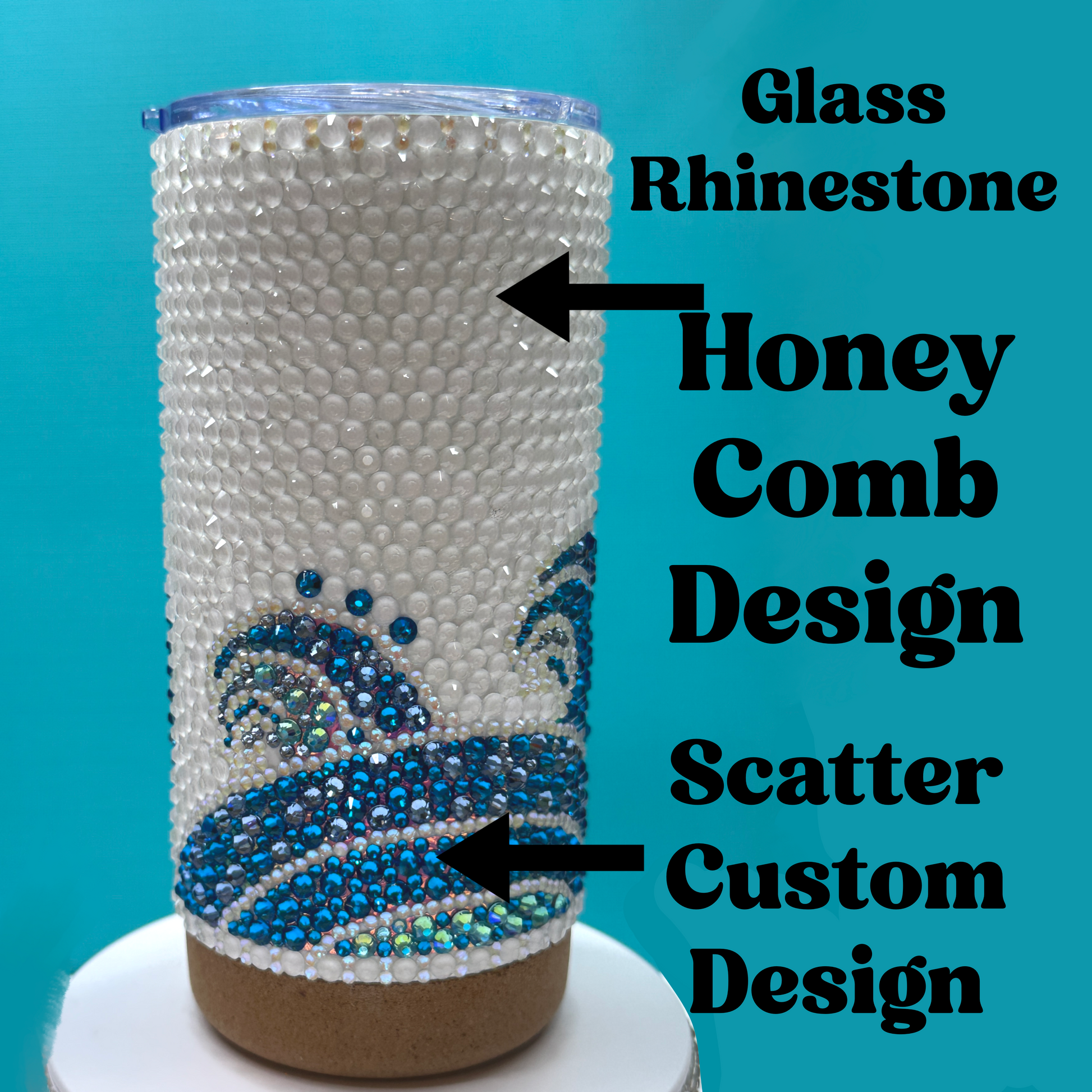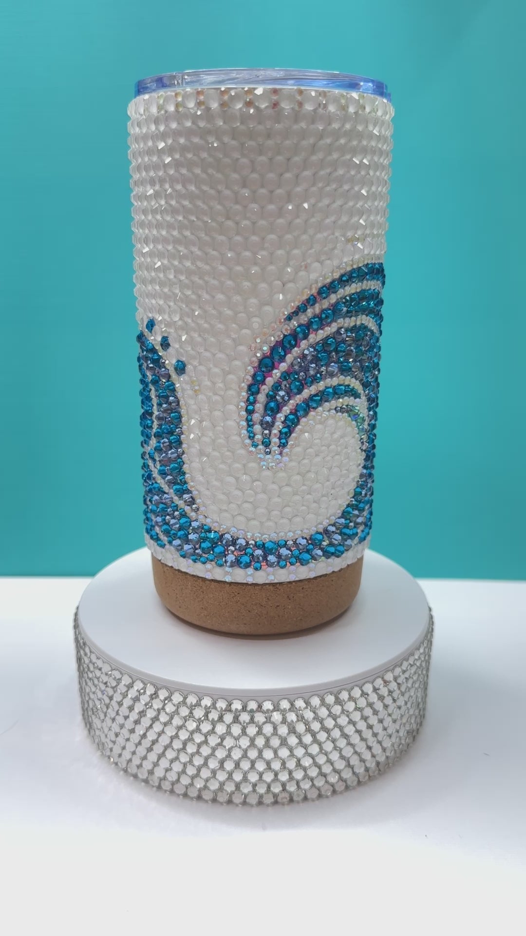 Custom designed tumbler of a beautiful ocean wave. Perfect for your coffee or for your cold drinks Perfect for your coffee or for your cold drinks. The shine and sparkle are one of a kind. The base is made of cork to help make a smooth landing on any surface. Hand made with great care and wonderful products.